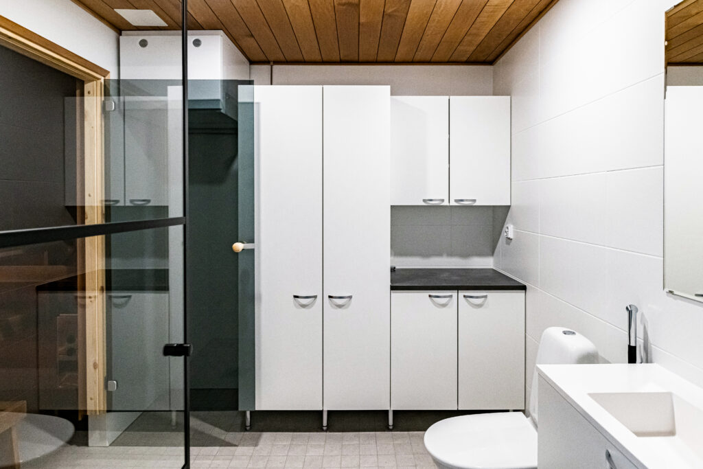 Kylpyhuoneessa on myös kodinhoidolle tilaa ja sinne mahtuu mm. korkea pesutorni. Terassi on katettu, joten terassikalusteesi säilyvät sateelta suojattuna.
